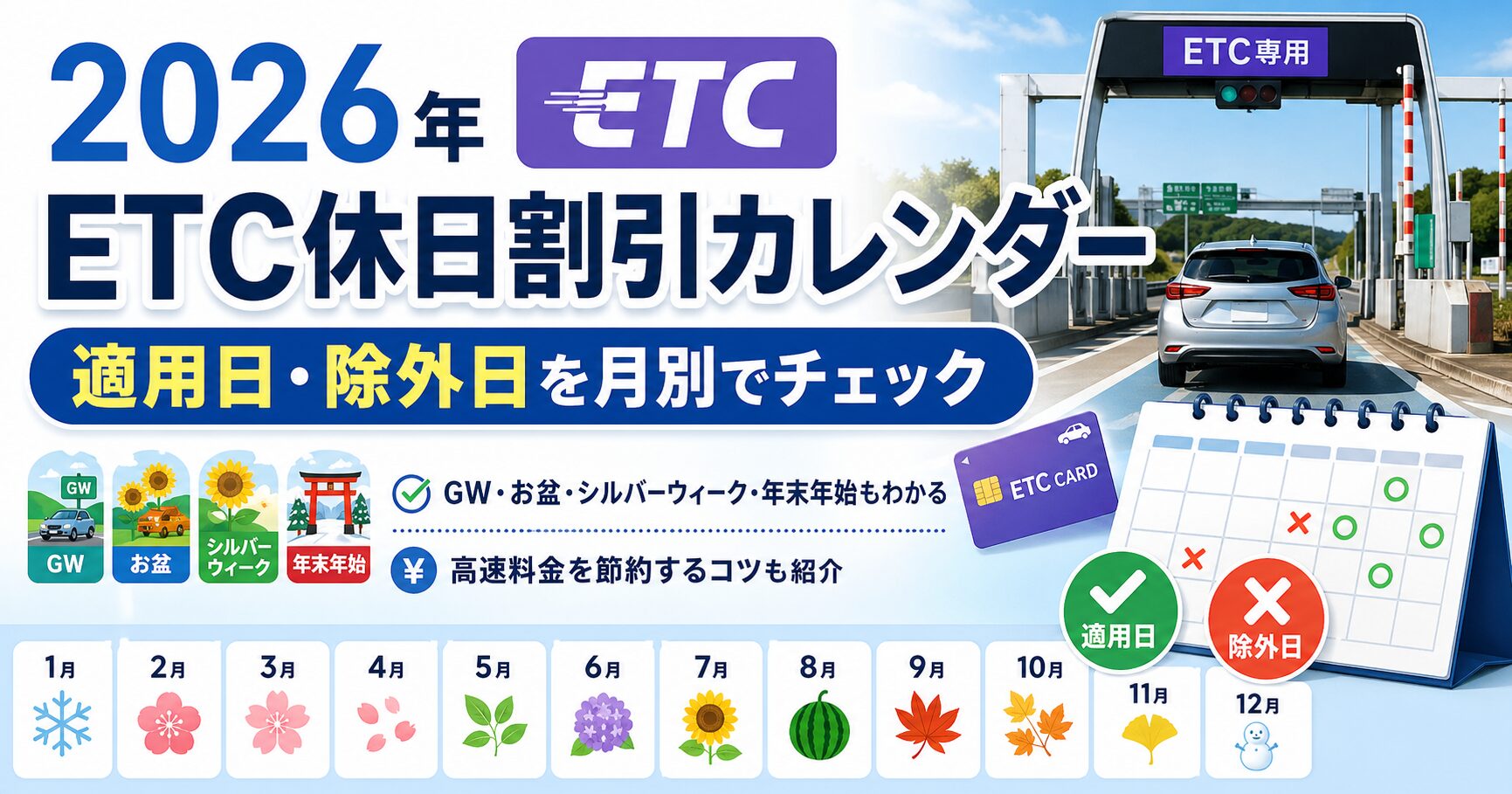この記事では、2026年1月〜12月のETC休日割引適用日・除外日をカレンダー形式でまとめました。